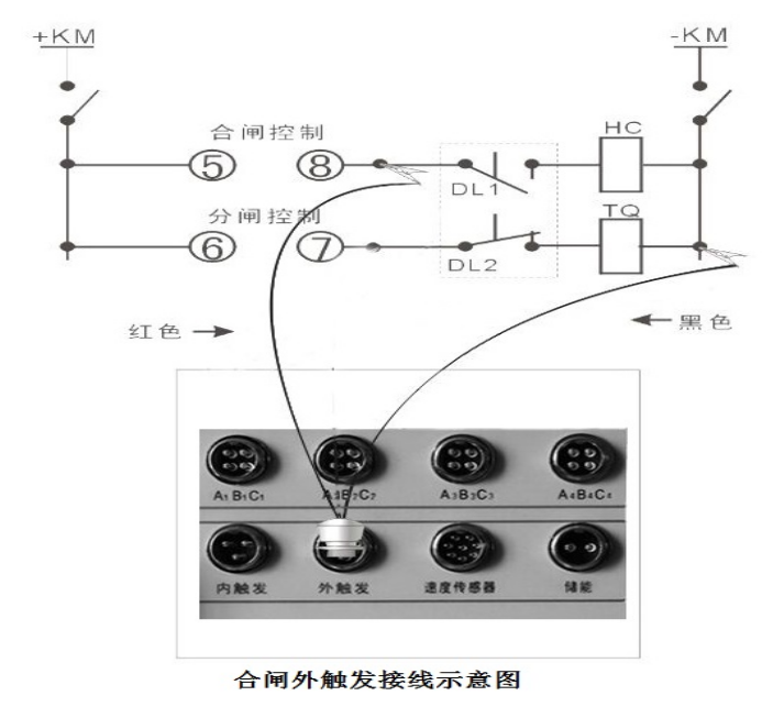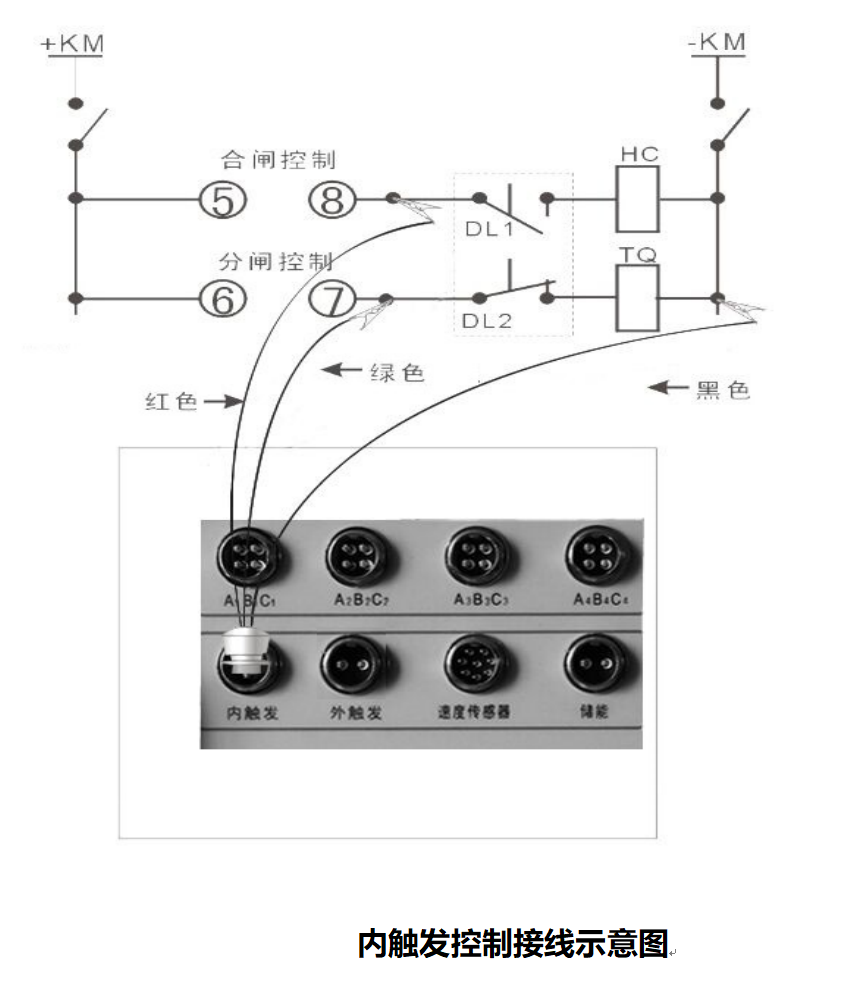現場試驗時,如果采用儀器內部電源,合閘控制線(紅色)、分閘控制線(綠色)、公共線(黑色)接入到儀器面板的“內觸發”端口(航空插頭), 儀器 分+、合+、負 輸出時,一般須接在輔助開關接點前(可有效保護線圈和儀器)。接線時注意切斷斷路器裝置自有的操作電源(斷開刀鍘或者拔掉保險),以免兩種電源沖突,損壞儀器.