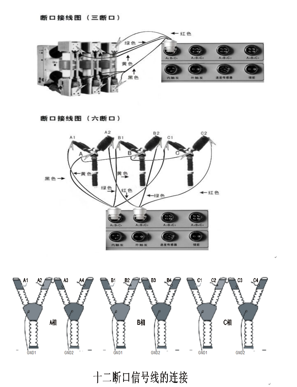 下圖中以三斷口和六斷口斷路器連接為例,斷口測試輸入接口都用上,連接方式為:A1、A2、接斷口輸入的黃線,B1、B2接斷口輸入綠線,C1、C2接斷口輸入紅線,對于三相三斷路器連接就只需用前一個斷口測試信號輸入接口,其中A1斷口為主斷口。(注:三斷口,六斷口斷路器共一個公共地GND)。
