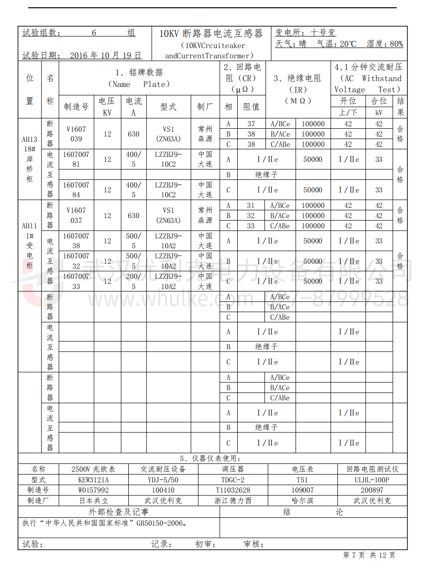 試驗(yàn)電壓、加壓時(shí)間、實(shí)測泄漏電流值;