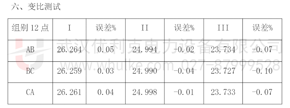 試驗數據:各分接擋位的測試數據,包括高壓側電壓、低壓側電壓、計算變比值、測試儀顯示變比值等。?